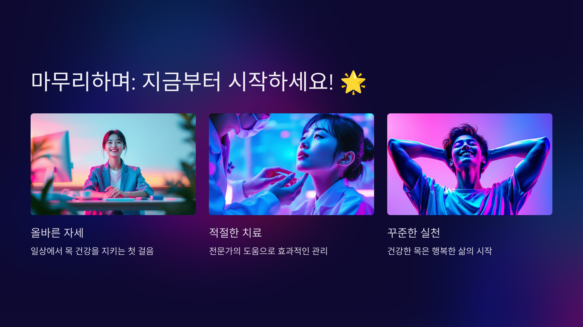 거북목은 누구나 쉽게 겪을 수 있지만, 올바른 자세와 적절한 치료를 통해 충분히 예방하고 개선할 수 있습니다. 오늘 알려드린 방법들로 여러분의 목 건강을 지켜보세요! 건강한 목은 행복한 삶의 시작입니다. 지금 바로 실천해보세요! 💪