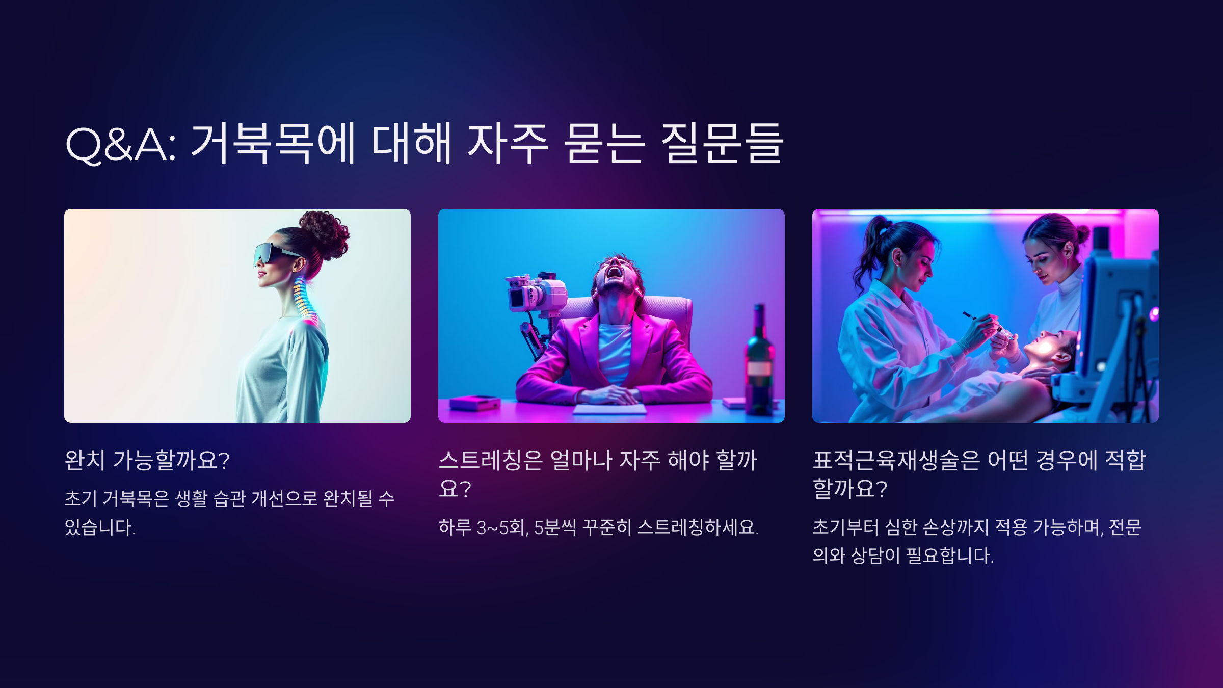 Q3. 표적근육재생술은 누구에게 적합한가요? A3. 초기 거북목부터 근육과 인대 손상이 심한 환자까지 모두에게 적합합니다. 단, 전문의 상담을 받으세요.