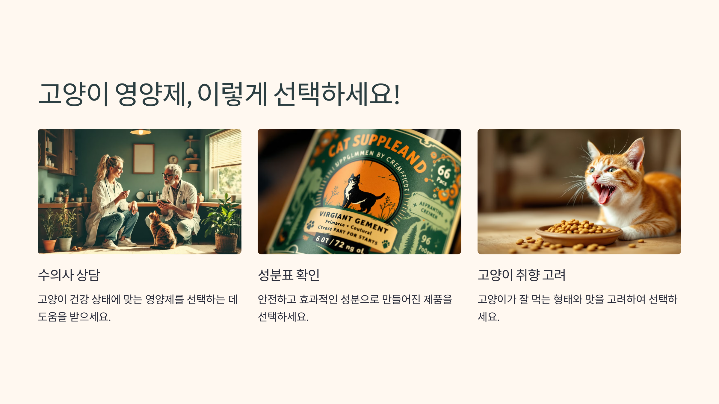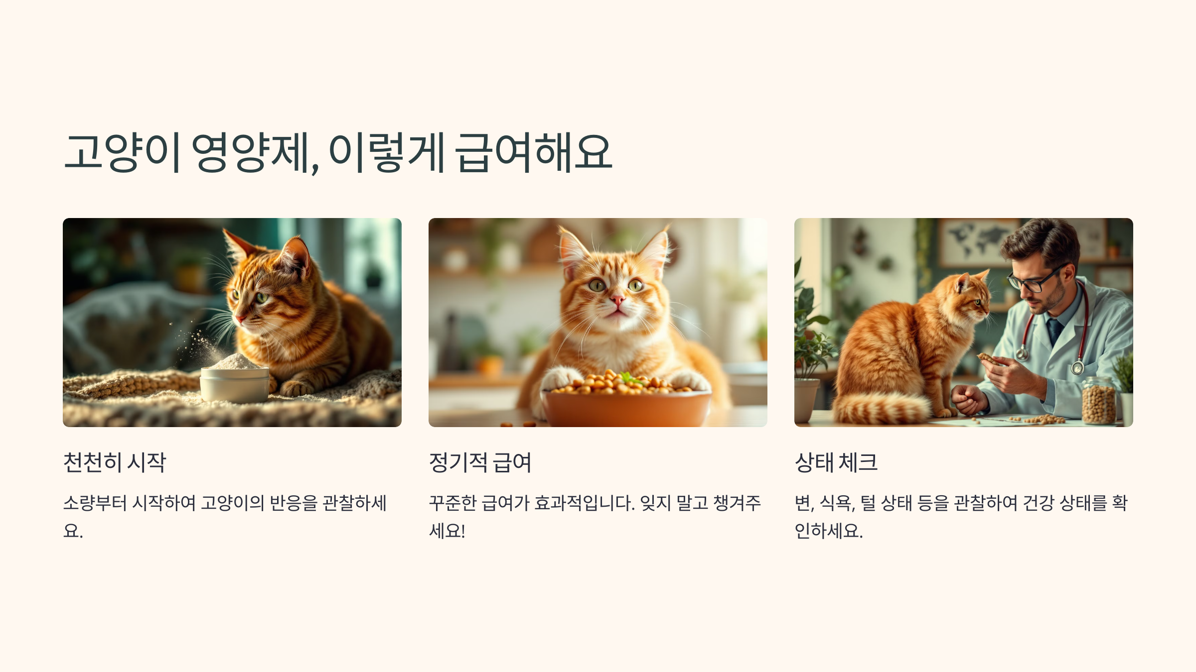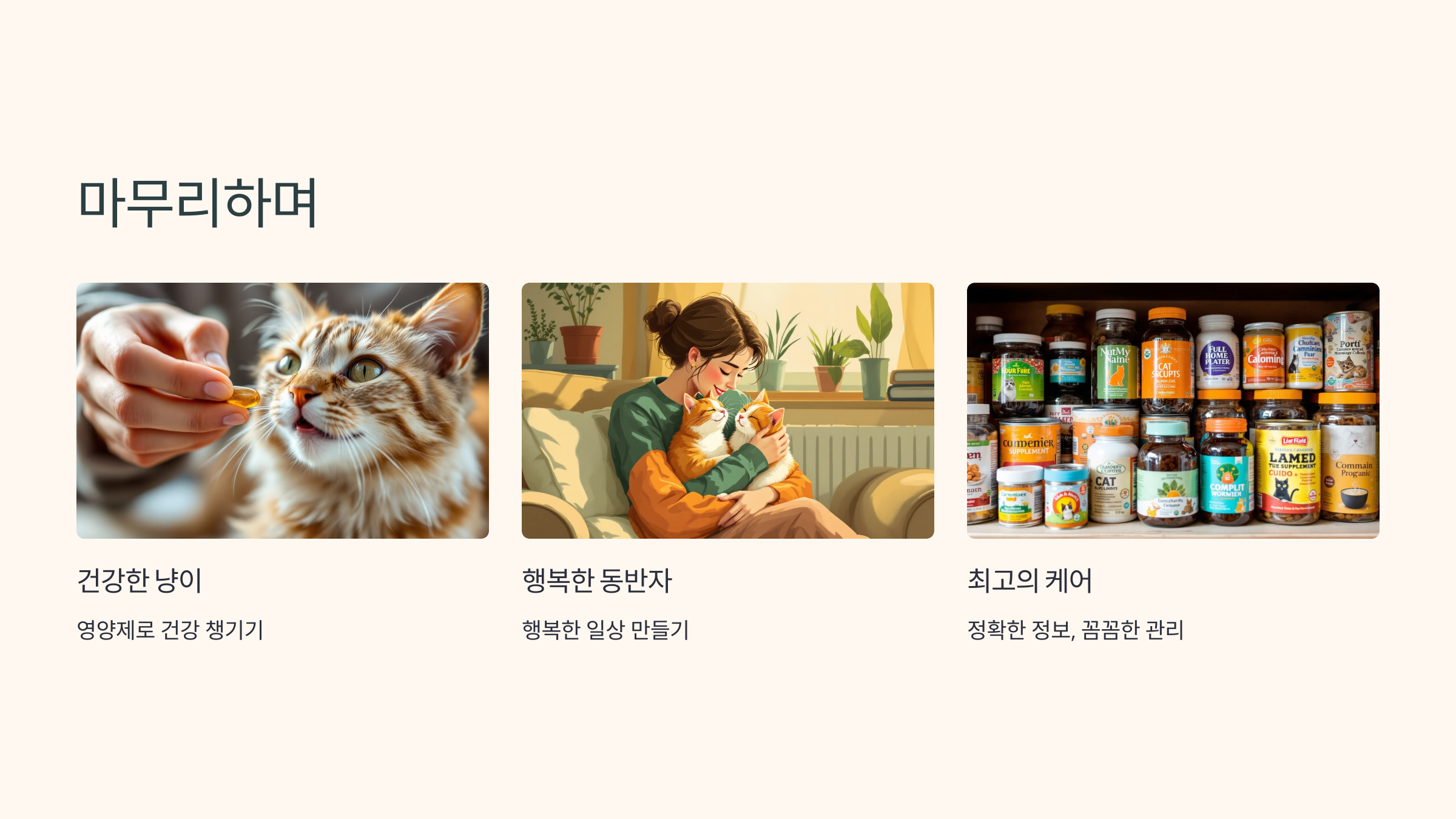 "오늘부터 우리 고양이를 위해 영양제를 시작해 보세요. 건강한 반려묘와의 행복한 일상이 기다리고 있을 거예요!"